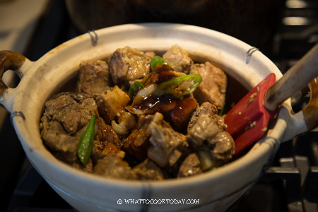 - Add the pork ribs and mushrooms to the clay pot followed by oyster sauce and kecap manis. Stir to mix. Add the broth from cooking the ribs. Let it cook for another minute. If you want it drier, just add few tablespoon. Stir to mix. Have a taste. It should be savory with hint of sweetness and umami. Proceed to serving