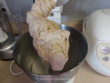 4. Start the mixer on low (“stir” on KA) and knead for about 2 minutes. It should come to a rough dough. If it’s too dry, you can add more milk, one teaspoon at a time. Once you get a rough dough that is slightly sticky, increase speed to 2 and knead for 5 minutes, the dough should be smoother and a bit stretchy at this point, but the dough will tear if you pull it.