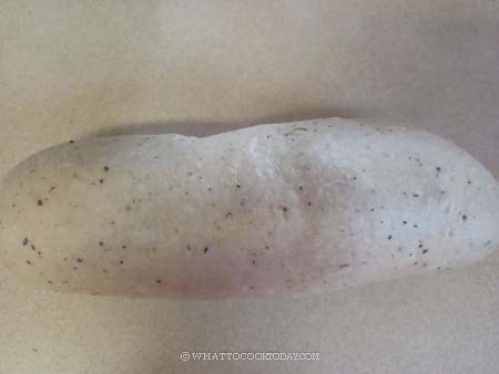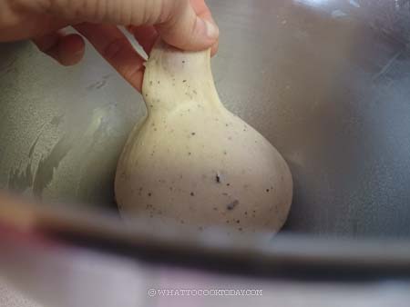 9. Remove the dough and put on your work surface. Deflate the dough by punching the dough down to release gas. Roll it up into a round dough ball again. Cover and let it rest for 10 minutes to let the gluten relax so we can shape it