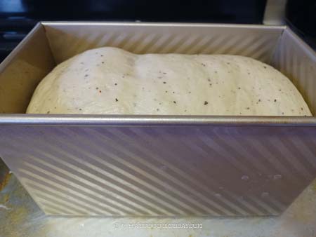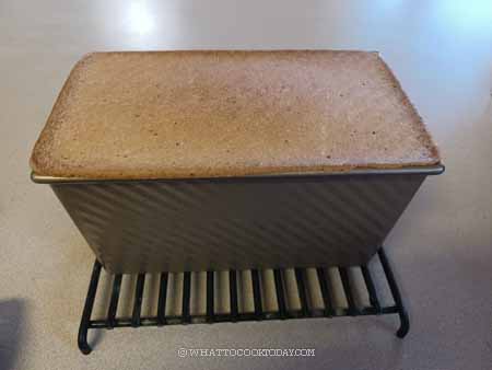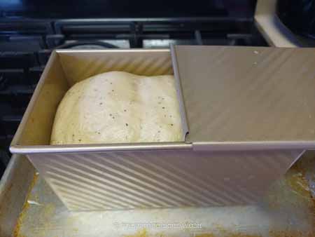12. If you plan to use the cover of the pullman loaf tin, proof until the dough about 1/2 inch below the rim of the pan. Close the lid. If you don’t plan to use the lid or you use regular loaf pan, proof until it reaches the rim of the pan. This may take 45 minutes to 1 hour in a warm place. The time depends on the temperature. So watch the dough closely. When you gently push on the dough, it should bounce back very slowly and leave some indentation. This shows that the final proofing is completed
