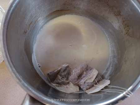 - Bring the milk just to just a gentle simmer, about 180 F (80 C) and then remove from the heat. Put the tea bags in and let the tea bags steep in the milk for about 8 minutes. Don't let the tea steep for too long or it can be too bitter. Squeeze out excess milk from the tea bags. Let the milk tea cool down to lukewarm (about 105 F or 40 C) by putting it on the ice bath to cool it down quickly, about 5 minutes or so.