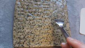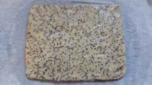 - Place the dough on a piece of parchment paper, large enough for a large baking pan. Shape the dough into about 8 x 8 inches square, about 1/2 an inch thick. I use a bench scraper and my hands to help me shape the dough. If you are really obssessed with getting it perfectly squared corner to corner, you can line a 8 x 8 inch square pan and press the dough onto the pan