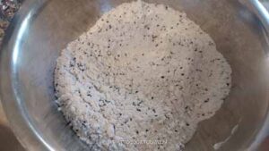 - Combine all-purpose flour, powdered sugar, salt and black sesame seeds in a large mixing bowl