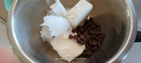 - Preheat the oven at 170 C (340 F). Put cream cheese, butter and dark chocolate in a heat-proof bowl that can sit on top of a saucepan with some water inside the pan, without the water touching the bowl. We will melt the cream cheese mixture over gently simmering water. Stir until they are all melted into a thick paste. Remove from the saucepan and wipe the bottom of the bowl