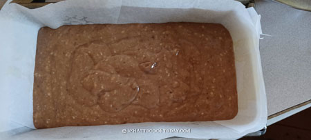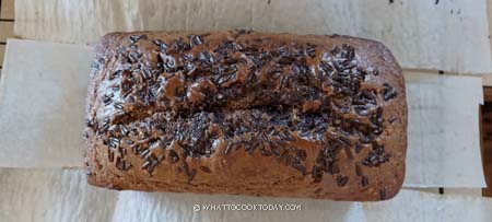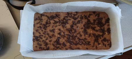 - Pour the batter into the prepared pan. Sprinkle with some chocolate sprinkles (chocolate rice). If you use larger-size chocolate, tossed them in a bit of flour and shake off excess flour to prevent the chips from sinking. Bake for 45 minutes- 1 hour (depending on your oven) or until a skewer inserted into the cake comes out clean