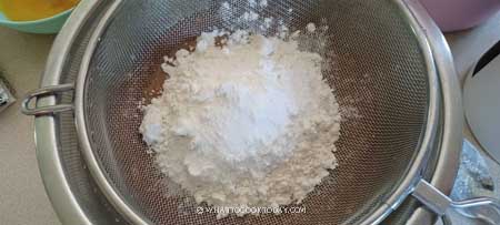 5. Sift in the cake flour, salt, baking powder, baking soda