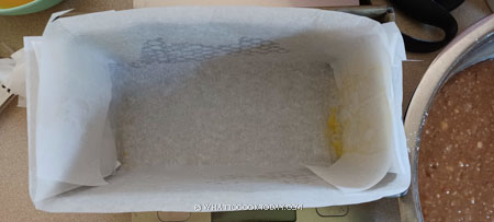 - Grease your pan with some oil and line your baking pan with parchment paper on all sides