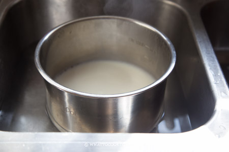 Gently submerge the inner pot into the water. This will cool down the milk pretty quickly. It takes about 6-8 minutes probably. It’s great because you don’t need an ice water bath.