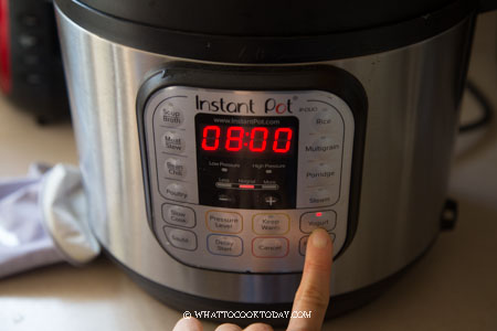 Close the lid. Venting position doesn’t matter here. Push the “YOGURT” button again and adjust until it reads “8:00” for 8 hours of incubation or adjust the time by using the “+/-” button. I usually do 8 hours. The longer you incubate, the sourer the yogurt will be.