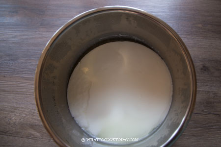 Put 3-4 Tbsp of yogurt or 1 cup of yogurt whey as a starter. Only do either one, not both. Stir to mix thoroughly, especially with yogurt as a starter. I use yogurt whey here in the photo.