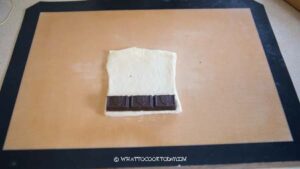 - Work with one rectangle at a time, roll the dough out a bit longer. Place the chocolate baton at the short end