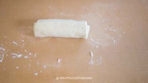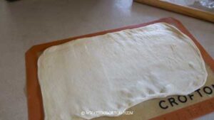 - After 30 minutes, dust your work surface with some flour, dust off any excess flour. Roll the dough out into about 12 x 40 inch rectangle using a rolling pin and try to deflate any air bubbles at the same time while you are rolling if any. If the dough tears, you can dust with a bit of flour to prevent stickiness