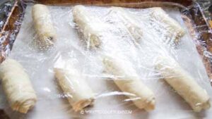 - Roll the dough up tightly from the short side, like a Swiss roll. Wrap with a plastic wrap so the dough doesn’t dry out and chill in the fridge for 20 minutes