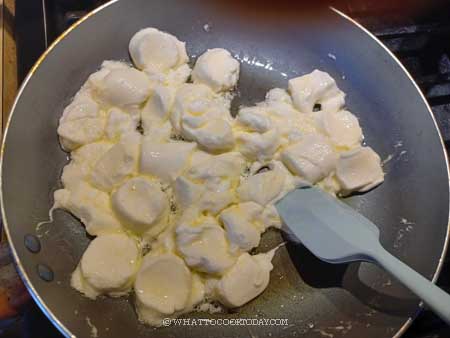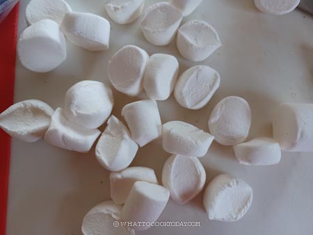 3. If you use large marshmallow, cut them into smaller pieces. They melt faster. We don’t want to overcook the marshmallow, which results in a tough nougat later