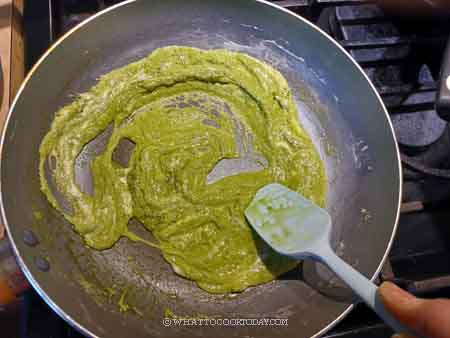 7. Add the milk powder and matcha mixture all at once and turn off the heat and keep stirring until the milk powder melts into the marshmallow
