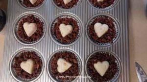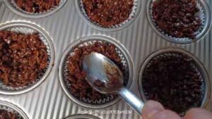 - Spoon the chocolate mixture into the muffin cups. Use the back of the spoon to press the cereal mixture into the pan, slightly hollow at the center and higher around the edge. The slightly hollow center is for you to put the heart-shaped chocolate. Press the cereal mixture firmly against the pan so they stick together and won't fall apart easily.