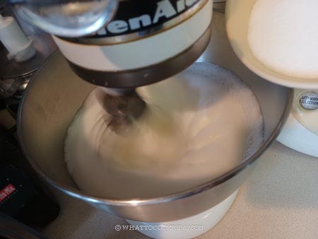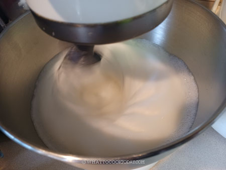 - Beat the egg whites on medium speed until frothy, add cream of tartar or lemon juice/vinegar and whip until it turns whitish and air bubbles are fine. Gradually add the sugar as you beat, in 3 batches. I beat them at medium speed (speed 6 on Kitchen Aid). This will take a bit longer compared to beating at high speed. I used to do higher speed (speed 8), but the meringue is smoother and nicer when I maintain the speed on 6. I highly recommend stopping several times to check on the consistency and scraping the sides of the bowl to make sure no sugar left on the side of the bowl. Whip until you reach a stiff peak but still have a slight bent on the tip. Then lower the speed to 4 and whip for 1 minute to even out large bubbles and stop beating