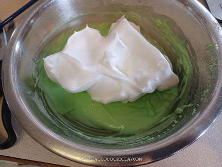 9. Then gently pour the batter into the meringue from the side of the bowl, so we won’t deflate the meringue