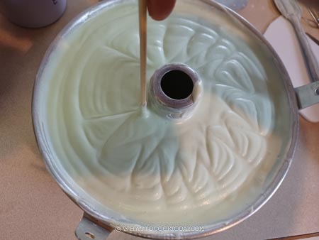 - Pour the batter into an UNGREASED chiffon cake pan. Use a rubber spatula to smooth the surface. Gently drop the cake pan from about 10 cm height on the counter 2-3 times. Use a skewer to draw a zig zag to pop bubbles inside the cake batter