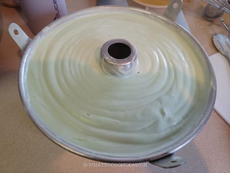 This egg white pandan chiffon cake has oil in the recipe, just like traditional chiffon cake does, except there are no yolks.