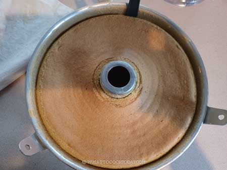 13. Once out of the oven, drop the cake pan from about 10 cm height on the counter several times to prevent shrinkage. Then carefully invert the pan upside down immediately. Please don’t be tempted to remove it from the pan if it’s still warm. It takes about one to two hours to cool down completely