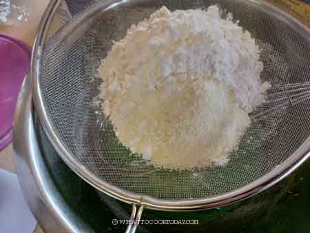 - Combine oil, coconut milk, and pandan juice. You will notice they are hard to combine because oil and water just don't mix. Sift in cake flour, cornstarch, salt, and milk powder. Use a whisk to mix the two. You will get a thick but flowy batter. Set aside