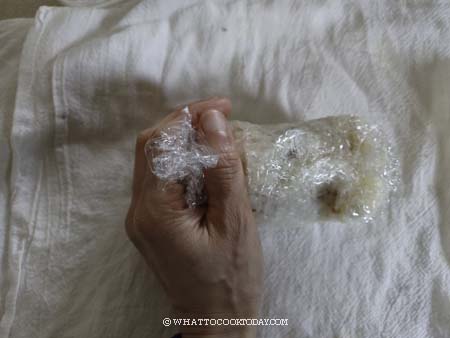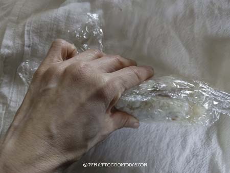 - Lay a piece of thick kitchen towel on a work surface. Lay another piece of plastic wrap/cling wrap on top of the towel. Spread about 1/3 of the rice you cook on the plastic wrap. You can use the rice spatula or your wet fingers to do so. The size should be enough to cover the dough stick and the filling