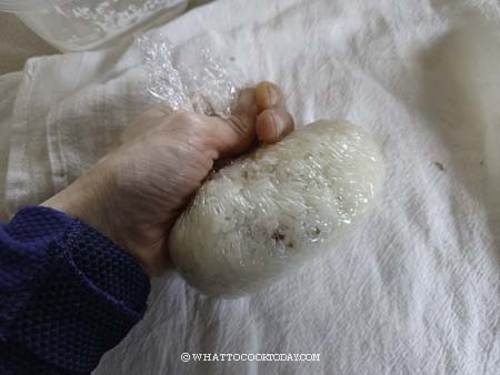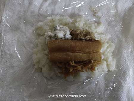 - Then spread some preserved mustard greens, meat floss, chili oil, you tiao, fried eggs if you use. Bring the two sides of the towel towards the center. So the rice will cover the filling. Squeeze the other two end to close the filling too. Then just squeeze and twist the cling wrap to tighten the roll up nicely