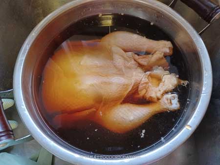 - Use a large pot that can accommodate the chicken and the brine. Put all ingredients for the brine in the pot and bring to a boil to dissolves sugar. Let it cools down completely, about an hour or so. The brine has to cool down completely before you put the chicken in1 cup light soy sauce, 1/4 cup dark soy sauce, 1 cup brown sugar, 12 cup water