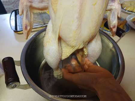 5. To dry the chicken: Place a tall jar that can support the weight of the chicken into the cavity of the chicken. So the chicken can stand right up. I place this inside the pot and put it inside the fridge overnight (about 8 hours) to let the skin dry