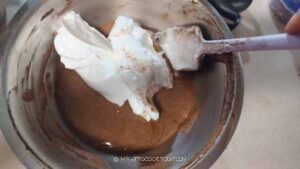 - Continue on with the second 1/3 of the meringue again to mix. You want to be gentler now but make sure the two are well-combined.