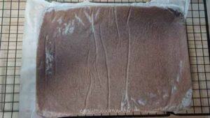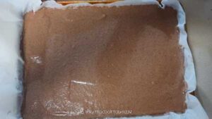 - Place one layer of the cake upside down on the plate and the parchment paper touches all the edges of the cake.