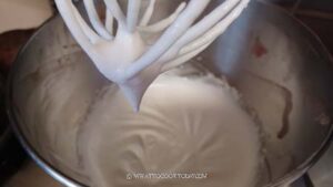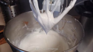 - I highly recommend stopping several times to check on the consistency and scraping the sides of the bowl to make sure no sugar left on the side of the bowl. Whip until you reach a stiff peak but still have a slight bent on the tip. Then lower the speed to 2 and whip for 1 minute to even out large bubbles and stop beating