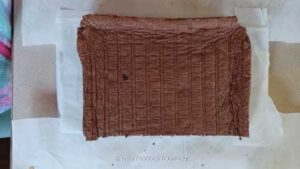 - Once the cake has cooled down completely, trim the 4 edges to make it need. Cut the cake into half.