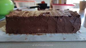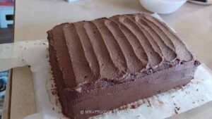 - Top with another layer of the cake, right side up. Put this in the fridge to let it set while you prepare the mousse frosting