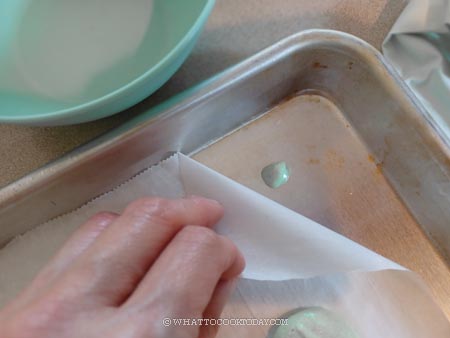 8. Do not try to peel the macarons off the parchment paper when they just come out from the oven. Let them cool down for at least 15 minutes and then peel the paper away from the macarons instead of pulling the macarons from the paper