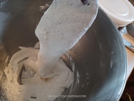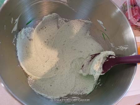3. Prepare meringue: Put the egg white in a mixing bowl or the bowl of the stand mixer fitted with a whisk attachment. Start whipping at speed 4 until it turns foamy with small fine bubbles. Add the small pinch of cream of tartar and whip for another minute. Increase the speed to 6 (don’t crank up speed higher than this) and add 1/3 of the sugar and whip for another 1-2 minutes before adding the next. Stop halfway to check the consistency. Whip until soft peak, meaning, when you lift the whisk up, the meringue will bent and still soft. If you want to add any color, add it here at this stage. Continue whipping until you reach a really stiff peak.