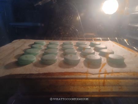 11. Preheat the oven to 350 F (180 C) for a conventional oven. For a convection oven, preheat to 325 F (165 C). I put my oven thermometer in too. I like to preheat it for at least 30 minutes. Let the macaron shells dry. This can take from 15 minutes to 1 hour or longer, depending on humidity. I have a ceiling fan and I put the macaron tray and let them air dry. It helps to speed up the drying process. The ceiling fan is perfect because it’s quite far from the macaron, so it’s not blowing directly on the macaron. It took about 20-25 minutes for the shells to dry (humidity was about 50% – cloudy day that day, but not too humid)