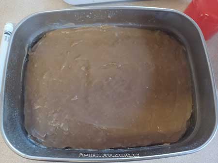 4. Spread this on the container that I have sprayed with non-stick spray. Smooth the surface with a spatula as much as you can. I use 6 x 4 inches container. You can use a glass dish too. Smooth the top with a spatula