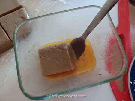 8. Prepare an egg wash in a small bowl and a bread crumb in a shallow platter. Preheat the air fryer at 350 F (180 C) for 5 minutes. Dip each milk pudding piece in a milk and then roll onto bread crumb to coat all the sides. Repeat with the rest