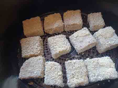9. Spray the basket of the air fryer with some non-stick spray. Arranged the coated milk pudding on the basket in one layer only. Spray with more cooking spray.