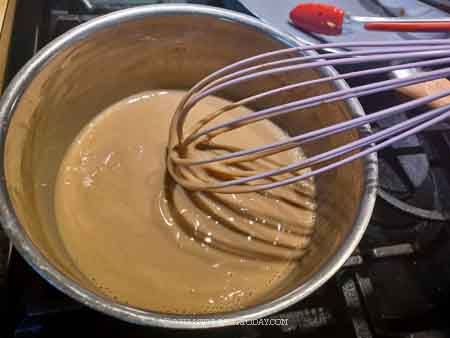 2. Put this on the stove and cook on medium-low heat and keep whisking. It may seem like nothing is going to happen, but keep whisking. You will start to feel some resistance as the mixture thickens.