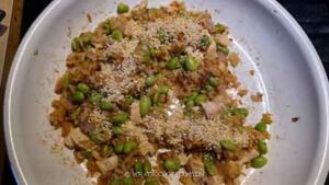 - Add the edamame, rice, chicken, and add the soy sauce and stir fry everything to make sure they are seasoned well. Have a taste and adjust the seasoning to suit your taste