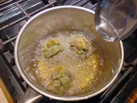 6. For deep-fried version, preheat some oil for frying. The oil needs to cover at least half of the shrimp balls during frying. When you put a skewer into the oil, you will see lots of bubbles around it. The oil is ready. Put the shrimp balls in, 2-3 at a time and move the shrimp balls around so they fry evenly without getting burn spots. Fry about 2-3 minutes or until golden brown. Remove from the oil to an absorbent paper towel and continue frying the rest