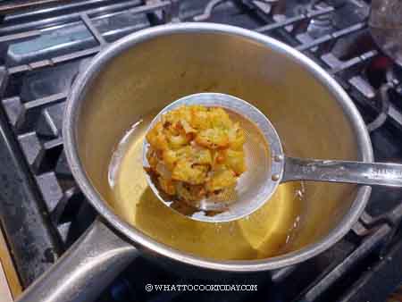 5. If you want to air fry, brush the bread cubes with some oil and arrange them inside the air-fryer basket and air fry at 350 F (180 C) for 5 minutes and then rotate so they brown more evenly and air fry another 2-3 minutes and check. The shrimp should cook through inside and golden brown on the outside. Just to warn you that the air fryer version won’t be able to give an even golden brown color compared to the deep-fried version