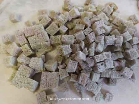 2. White sandwich bread is usually used to coat the shrimp balls. You are welcome to use any bread you want to use up. When ready to assemble, trim the crust off the bread. Cut into about 1/2-inch cubes
