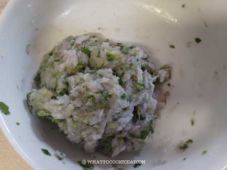 1. You will need approximately 340-350 grams of unpeeled shrimp. Peel and deveined the shrimp. Put it in a food processor and pulse a few times to turn it into a paste consistency. Mix with the rest of the ingredients. Cover and let it marinate for at least 1 hour or overnight