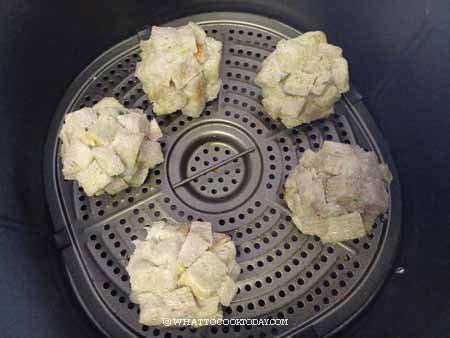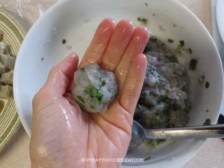- Scoop about 2 tablespoons (or more if you want a larger size) of the shrimp mixture and shape it into a ball with your lightly wet hands to prevent sticking. Roll this on the bread cubes to make sure the surface is all covered by bread cubes. Use your palm to squeeze a bit to make sure the bread cubes are attached to the sticky shrimp mixture nicely so they won't fall off during cooking.