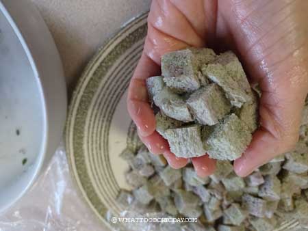 4. Roll this on the bread cubes to make sure the surface is all covered by bread cubes. Use your palm to squeeze a bit to make sure the bread cubes are attached to the sticky shrimp mixture nicely so they won’t fall off during cooking.
