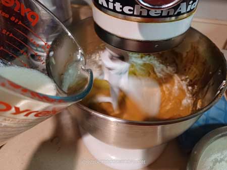 5. Switch to a low speed and add 1/3 of the flour mixture and alternate with 1/3 of the homemade buttermilk. Stop the mixer